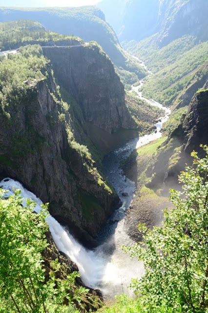 Nejradši bychom tu zůstali navždy, ale čas běží a my toho musíme ještě hromadu stihnout. Balíme plavky a míříme k poslední zastávce dnešního dne - vodopádu Voringsfossen. Toto je konečně vodopád, co stojí za vidění. Padá do rokliny, která se záhy rozšiřuje na Eidfjord. Na Voringsfossen se můžeze jít podívat ze dvou stran - první je hned u silnice, všude stánky, turisti, zmatek, výhled taky není nic extra, protože vodopád (vpravo) je částečně schovaný za skálou. Jako měřítko hloubky rokle slouží červený hotel na jejím okraji.